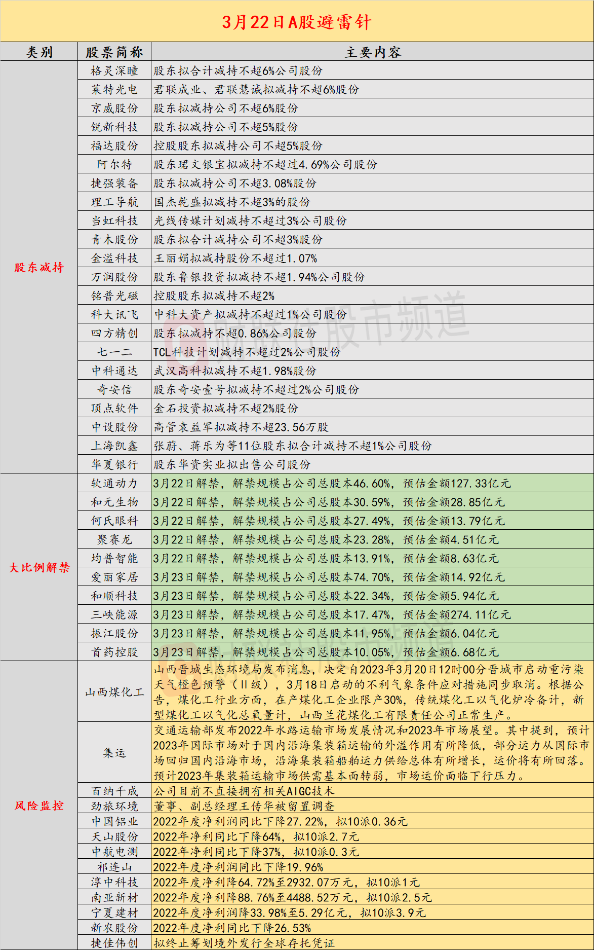 昨日A股拟减持规模较之前有所减少,格灵深瞳股东拟合计减持不超6%公司股份,莱特光电股东君联成业、君联慧诚拟减持不超6%股份;和元生物、软通动力将迎来超三成以上解禁;山西晋城启动重污染天气橙色预警,要求在产煤化工企业限产30%;百纳千成称公司目前不直接拥有相关AIGC技术;交通运输部预计2023年沿海集装箱运价将有所回落;劲旅环境董事、副总经理王传华被留置调查;预计巴西今年将出口9600万吨大豆,创历史纪录。