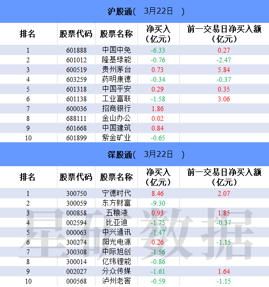 财联社3月22日电,北向资金今日净买入4.79亿元。宁德时代、招商银行、五粮液分别获净买入8.46亿元、1.86亿元、0.93亿元。东方财富净卖出额居首,金额为9.3亿元。