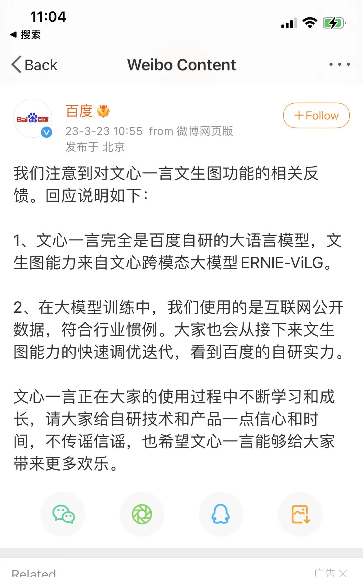 百度:文心一言的文生图能力来自文心跨模态大模型ERNIE-ViLG 使用的是互联网公开数据