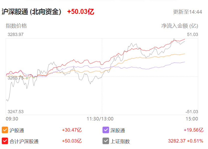 财联社3月23日电,截至发稿,北向资金净流入超50亿元,其中沪股通净流入超30亿元,深股通净流入超19亿元。