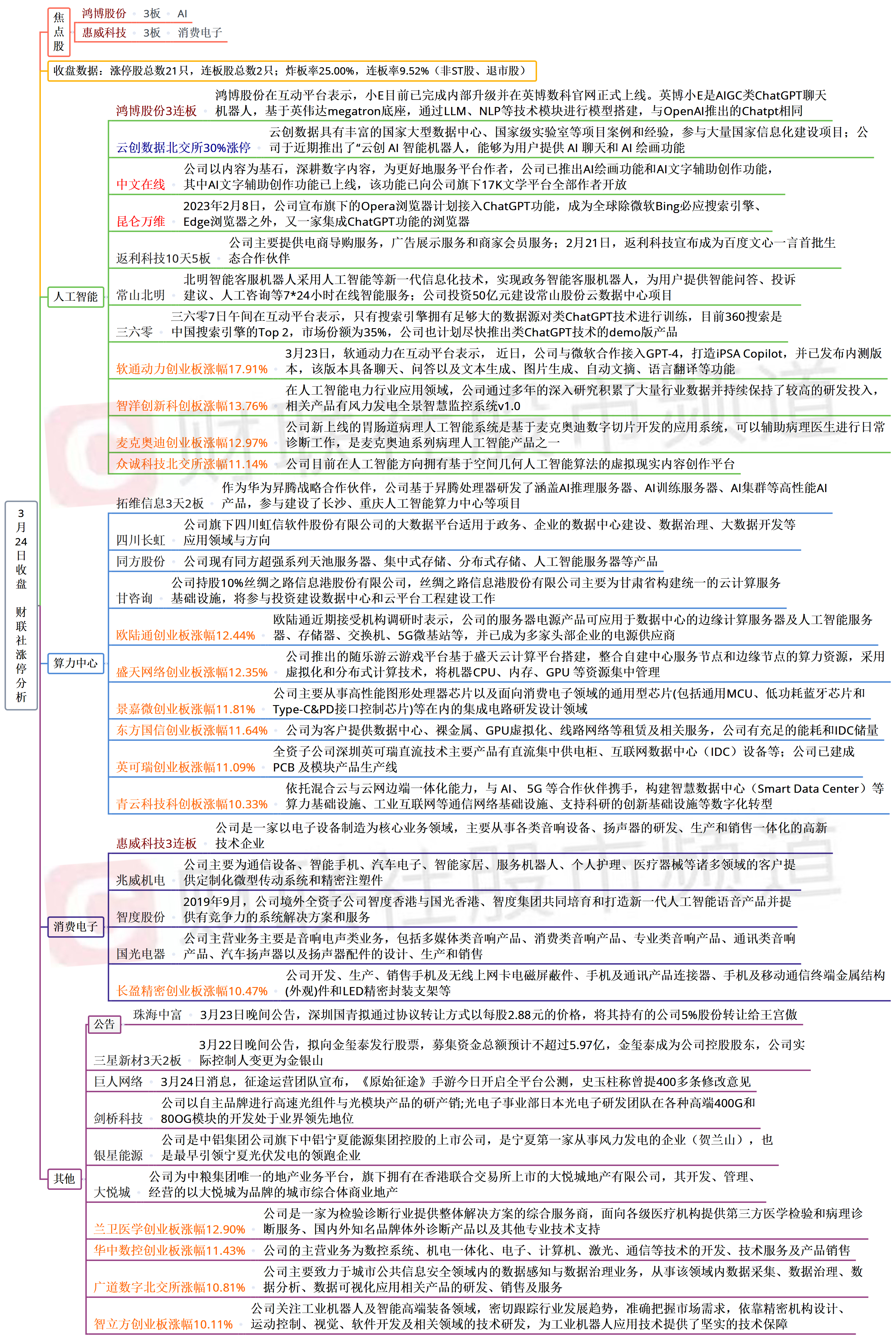 今日共21股涨停,连板股总数2只,7股封板未遂,封板率为75%(不含ST股、退市股及未开板新股)。个股方面,人工智能概念股鸿博股份3板、云创数据北交所首板、返利科技10天5板、中文在线创业板首板、昆仑万维创业板首板,消费电子板块惠威科技3板,算力方面拓维信息3天2板,拟实控人变更的三星新材3天2板。今日收涨个股2249只,收跌个股2507只。