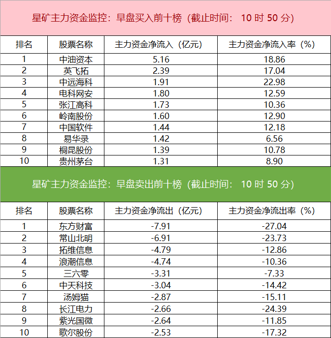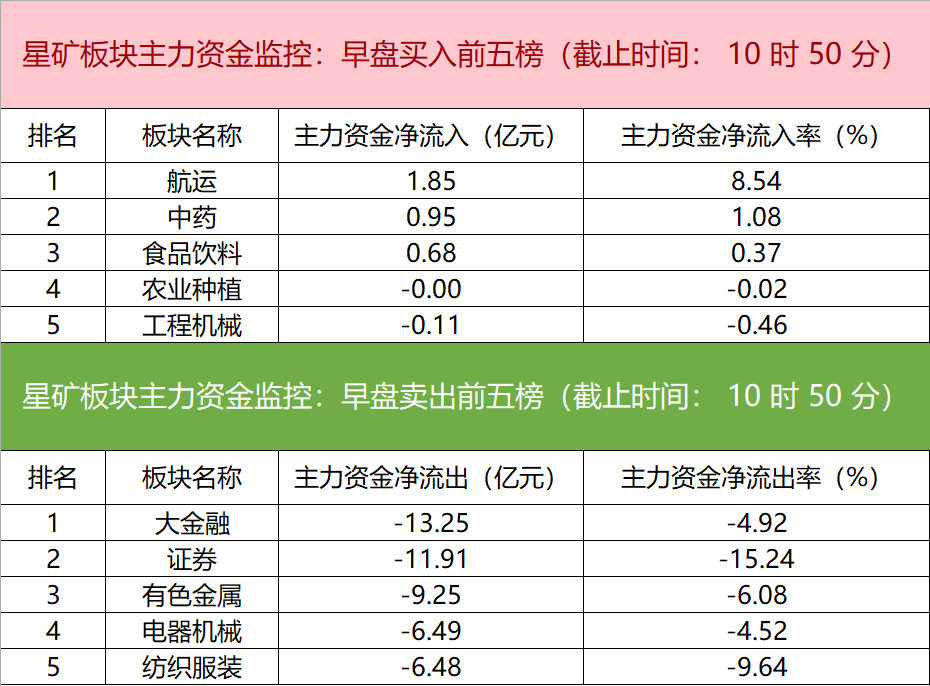 财联社3月28日电,财联社星矿数据显示,今日早盘主力资金净流入航运、中药、食品饮料等板块,净流出大金融、证券、有色金属等板块,其中净流出大金融板块超13亿元。个股方面,中油资本一度涨停,主力资金净买入5.16亿元,英飞拓、中远海科、电科网安获主力资金净流入居前;东方财富遭净卖出超7亿元,常山北明、拓维信息、浪潮信息主力资金净流出额居前。