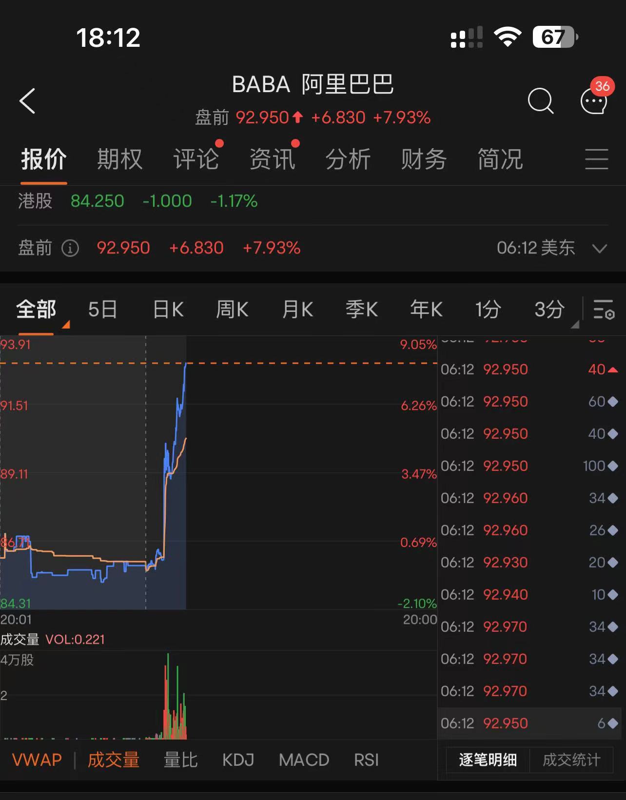 财联社3月28日电,阿里巴巴股价在美股盘前交易中的涨幅扩大至近8%。此前阿里巴巴宣布设立六大业务集团,或将独立上市。