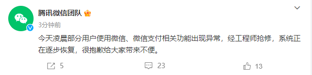 腾讯微信:相关功能出现异常 系统正在逐步恢复