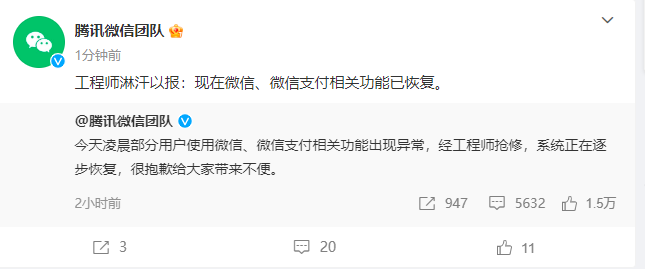 财联社3月29日电,腾讯微信团队最新表示,现在微信、微信支付相关功能已恢复。此前,部分用户使用微信、微信支付相关功能出现异常。