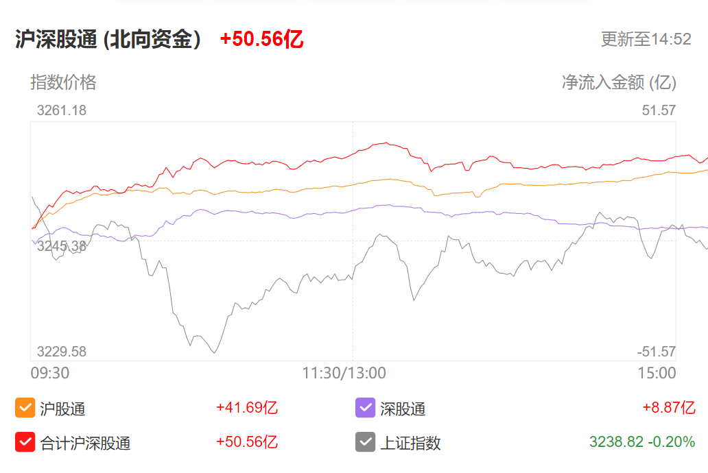 财联社3月29日电,截至发稿,北向资金净流入超50亿元,其中沪股通净流入超41亿元,深股通净流入超8亿元。