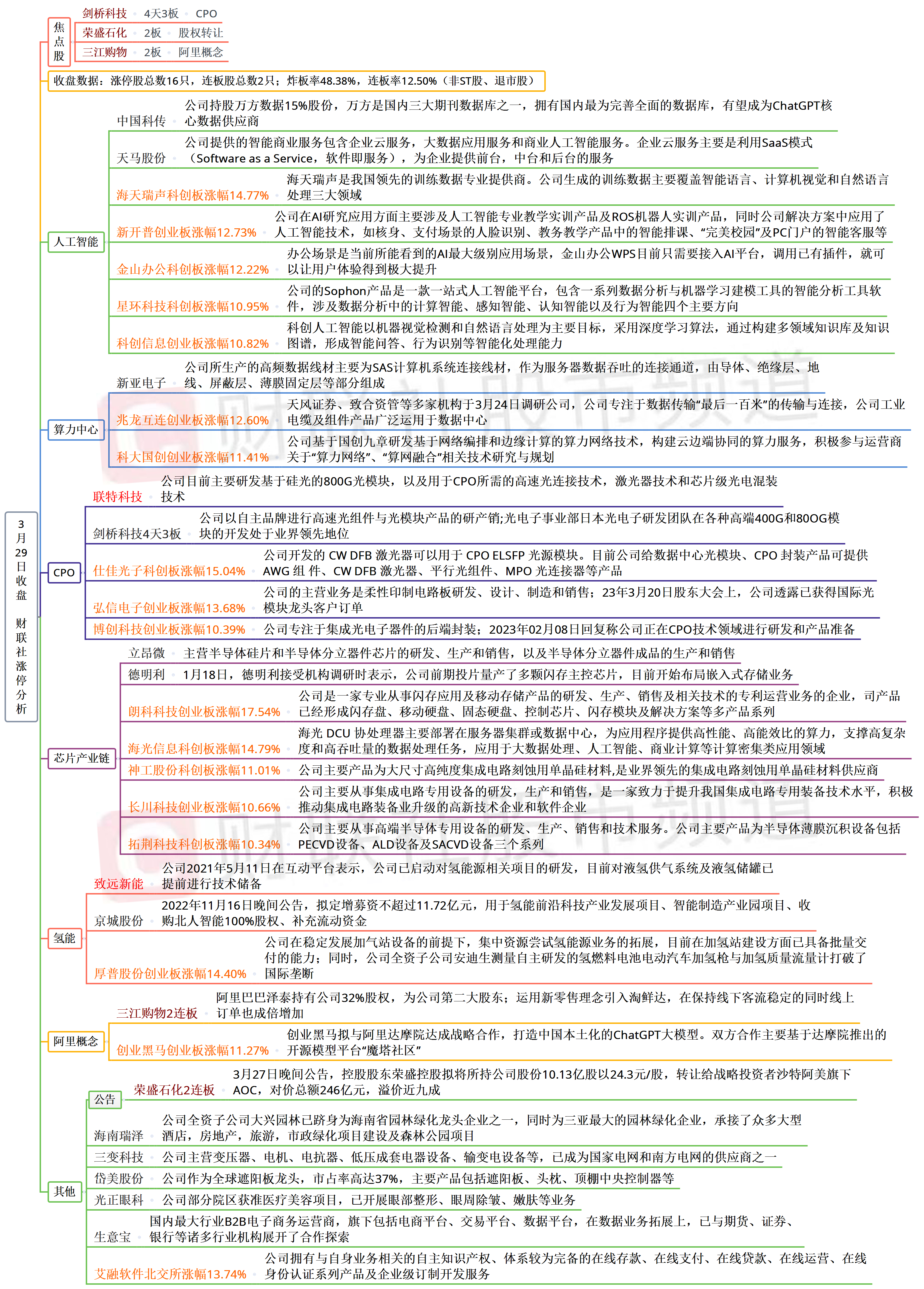 今日共16股涨停,连板股总数2只,15股封板未遂,封板率为52%(不含ST股、退市股及未开板新股)。个股方面,CPO概念股剑桥科技4天3板、联特科技创业板首板,阿里巴巴概念股三江购物2板,股权转让的荣盛石化2板,氢能板块致远新能创业板首板。今日收涨个股1523只,收跌个股3301只。