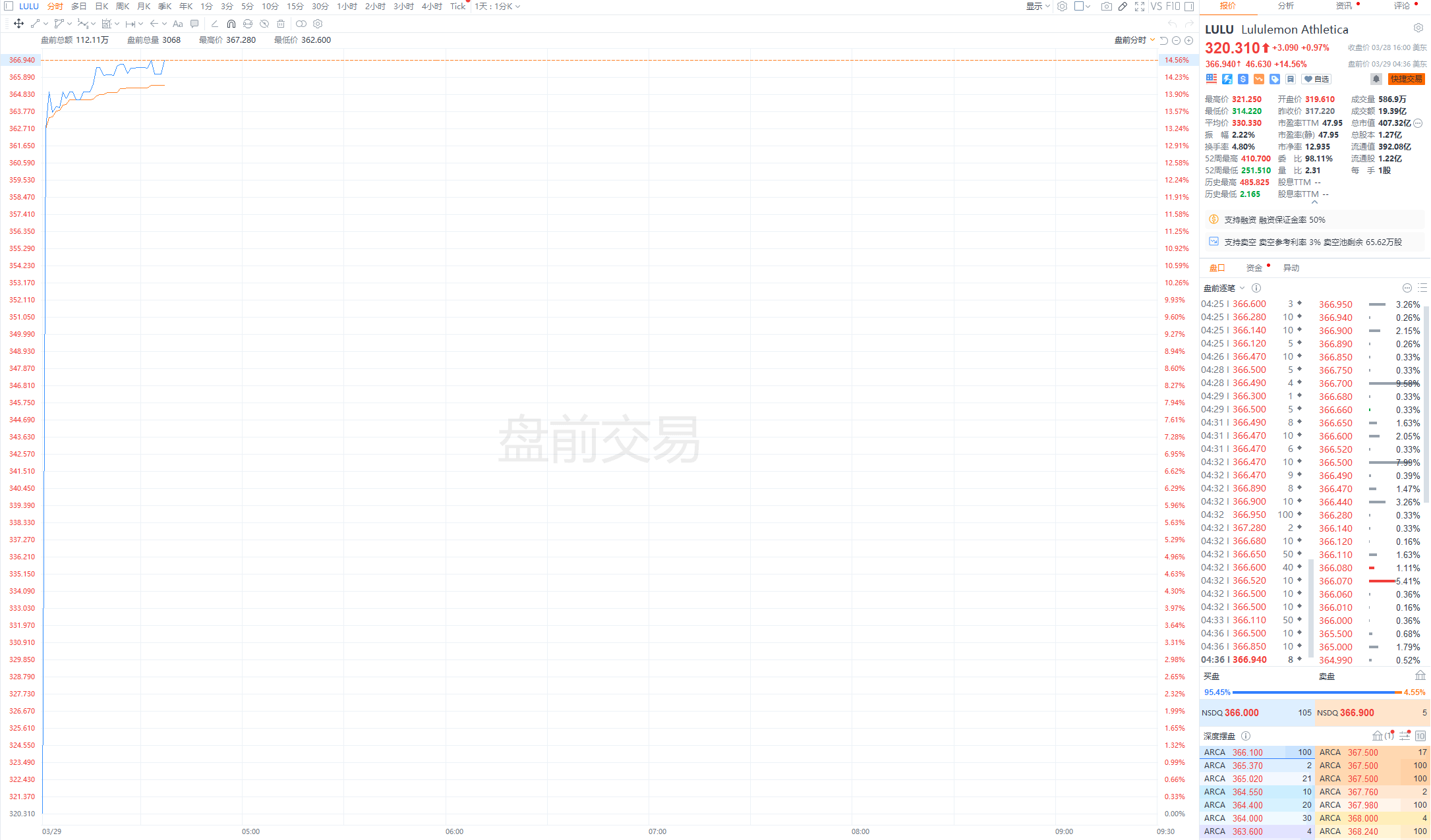 财联社3月29日电,Lululemon美股盘前大涨逾14%,Q1与2023财年营收指引均超预期。