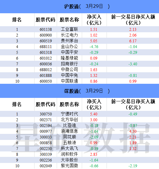 财联社3月29日电,北向资金今日净买入43.23亿元。宁德时代、贵州茅台、北方华创分别获净买入5.4亿元、5.05亿元、3.0亿元。金山办公净卖出额居首,金额为4.76亿元。