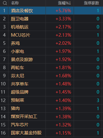 财联社3月30日电,大盘全天探底回升,三大指数均小幅上涨。盘面上,大消费概念股午后集体走强带动指数反弹,其中旅游酒店方向,全聚德涨停,西安饮食涨超8%;家电方向,飞科电器涨停,美的集团涨近6%;猪肉方向,新五丰涨停,巨星农牧涨超6%;零售方向,三江购物3连板,人人乐涨停。存储芯片概念股大涨,普冉股份、江波龙、同有科技均20CM涨停。金融股午后异动,红塔证券涨超5%,邮储银行涨超3%。下跌方面,数字经济及ChatGPT概念股集体调整,海天瑞声跌超18%,中兴通讯、中国科传一度跌停。总体上个股跌多涨少,两市超2900只个股下跌。沪深两市今日成交额9446亿,较上个交易日缩量365亿。板块方面,酒店旅游、厨卫家电、猪肉、煤炭等板块涨幅居前,国资云、ChatGPT、东数西算、数据要素等板块跌幅居前。截至收盘,沪指涨0.65%,深成指涨0.62%,创业板指涨0.5%。北向资金全天净买入48.07亿元,其中沪股通净买入23.91亿元,深股通净买入24.16亿元。