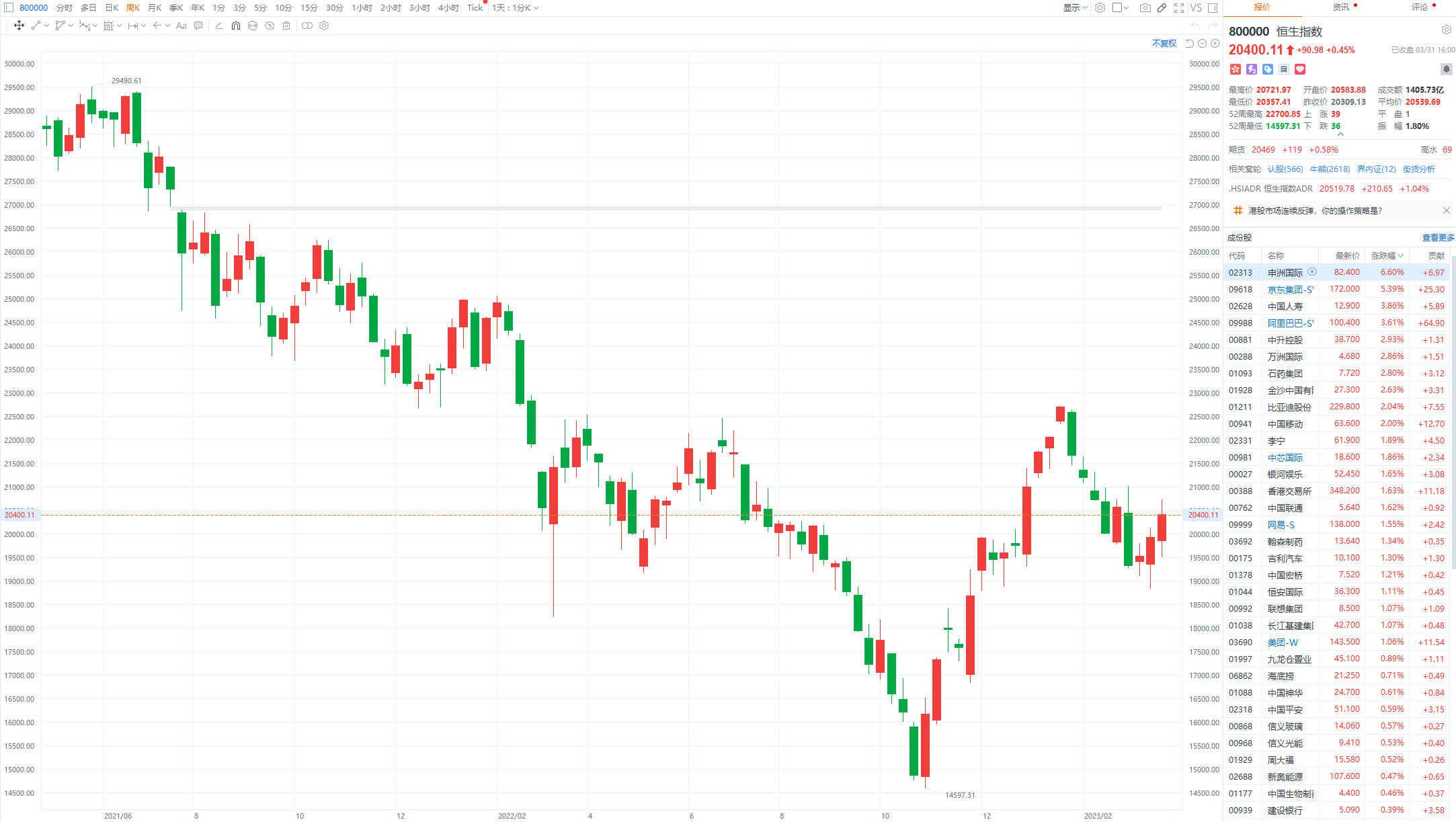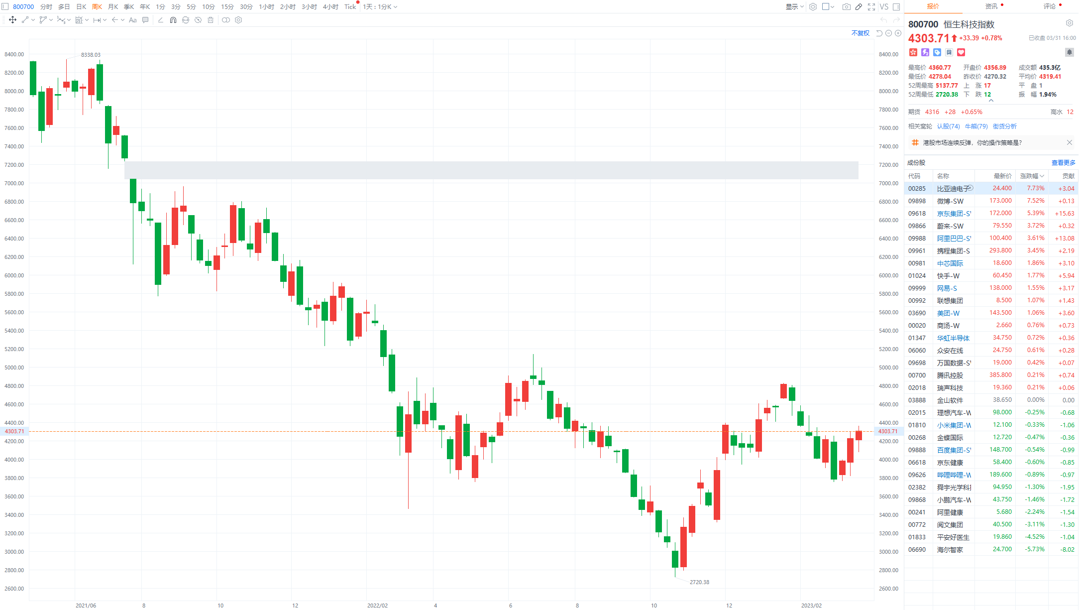 财联社3月31日电,香港恒生指数收涨0.45%,本周累涨2.43%,3月份累涨3.1%;恒生科技指数涨0.78%,本周累涨1.87%,3月份累涨9.65%。微博涨超7%,京东集团涨逾5%,阿里巴巴、蔚来涨超3%。