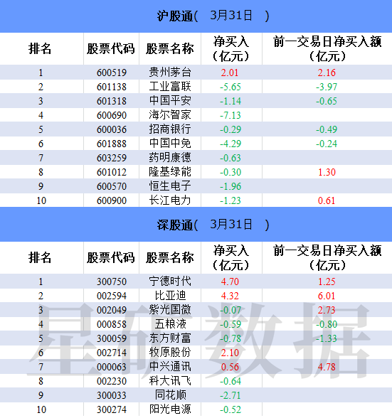 财联社3月31日电,北向资金今日净买入16.74亿元。宁德时代、比亚迪、牧原股份分别获净买入4.7亿元、4.32亿元、2.1亿元。海尔智家净卖出额居首,金额为7.13亿元。