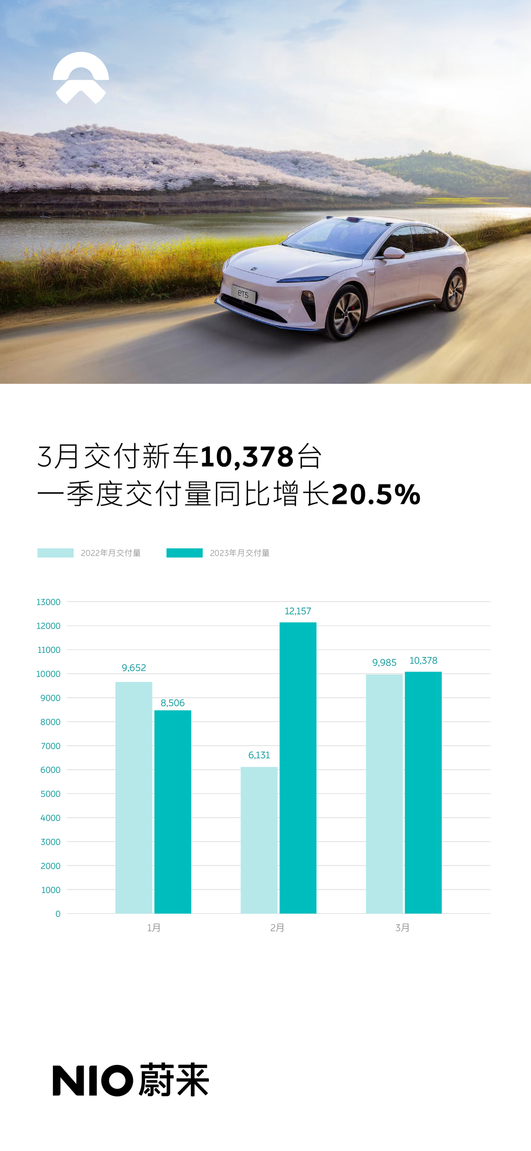 财联社4月1日电,蔚来公布2023年3月交付量,交付新车10378台,同比增长3.9%,其中高端智能电动SUV交付3203台,高端智能电动轿车交付7175台。2023年第一季度,蔚来共交付新车31041台,同比增长20.5%。截至目前,蔚来新车累计已交付320597台。