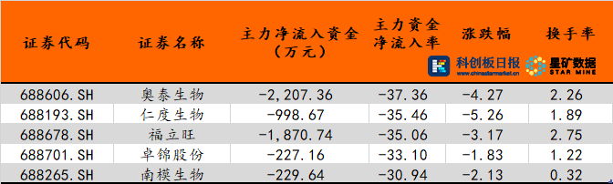 数据|科创板主力资金净流出267股 奥泰生物流出率最高