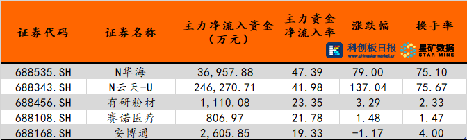 《科创板日报》4日讯,科创板日报•星矿数据统计显示,今日主力资金净流入的科创板个股共有245只,N华海净流入3.70亿元,主力资金净流入率居首;N云天-U、有研粉材紧随其后。主力资金净流出的科创板个股共267只,奥泰生物流出率最高,共流出2207.36万元,其次是仁度生物、福立旺。