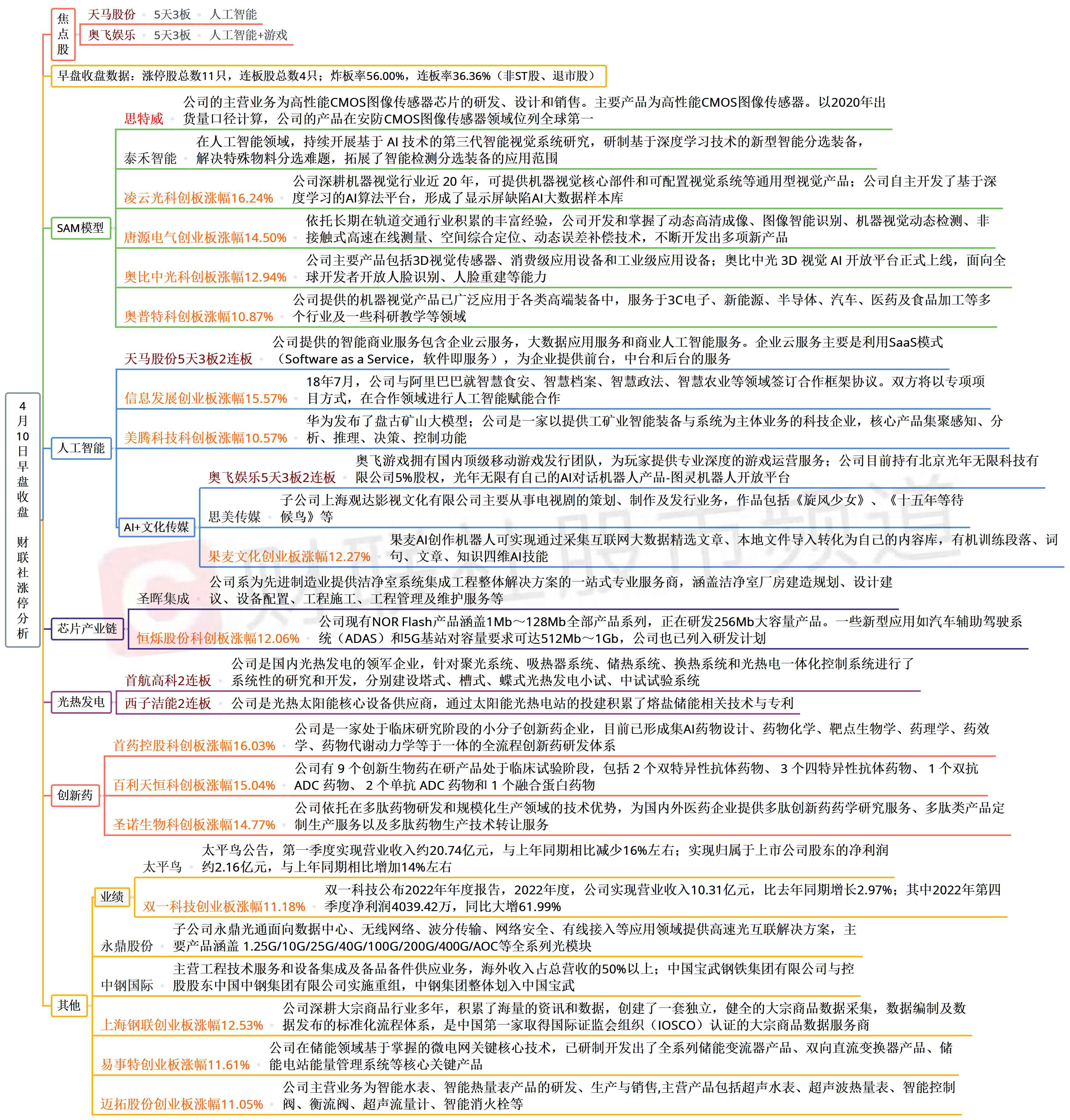 今日午盘两市共11股涨停,连板股总数4只,14股封板未遂,封板率为44%(不含ST股、退市股及未开板新股)。个股方面,人工智能板块天马股份5天3板、奥飞娱乐5天3板,光热发电概念股首航高科2板、西子洁能2板,SAM模型概念股思特威科创板首板。