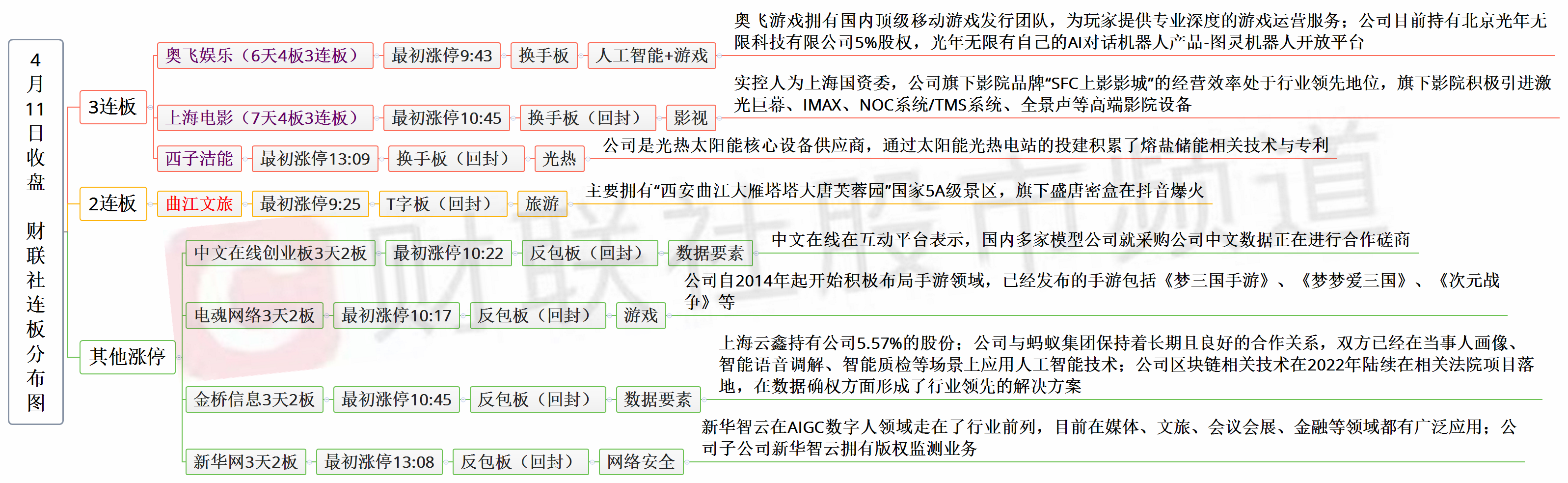 今日共30股涨停,连板股总数4只,上一交易日共18股涨停,涨停股晋级率22.22%(不含ST股、退市股及未开板新股)。个股方面,短线情绪有所回暖,资金追涨热情不减,奥飞娱乐、上海电影、西子洁能皆成功晋级3板,中文在线、电魂网络、金桥信息、新华网涨停反包。板块方面,人工智能板块经历昨日深度调整后迎来反弹,但力度欠佳,成交超百亿的大流量标的三六零跌超5%,浪潮信息涨9.07%未敢尝试封涨停,资金避开核心标的,反而选择拉升低位的传媒股;中文在线在互动平台表示,国内多家模型公司就采购公司中文数据正在进行合作磋商,受该消息影响,数据要素板块表现强劲,中国科传、视觉中国等涨停。