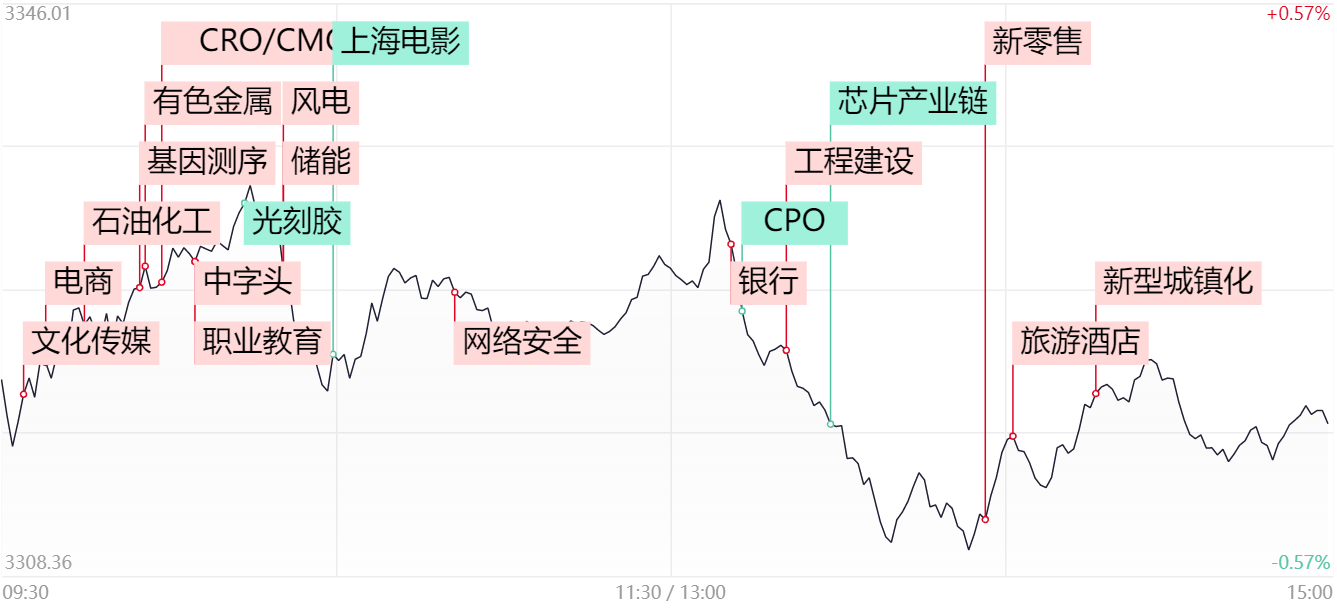 财联社4月14日电,上个交易日,三大指数早盘集体低开,午后进一步震荡探底,截至收盘,沪指跌0.27%,深成指跌1.21%,创业板指跌0.97%。沪深两市成交额11369亿,较前个交易日放量47亿,连续第8个交易日突破1万亿元。1)AI应用方向强势依旧,传媒、电商方向领涨,传媒股奥飞娱乐5连板,慈文传媒3连板,中文传媒2连板,浙版传媒、天娱数科、中国出版涨停,世纪天鸿20CM首板。电商股中吉宏股份、联络互动、搜于特涨停。信达证券研报认为,有望看到23年下半年国内AI应用端收入落地。2)大消费板块持续活跃,旅游酒店、商业零售方向领涨,旅游酒店板块中曲江文旅4连板,三特索道、西安旅游、西藏旅游涨停,西域旅游大涨12%。商业零售板块小商品城2连板,中央商场大涨9%,人人乐、杭州解百大涨超6%。根据携程发布的五一假期旅游前瞻发现,国内游订单同比去年增长超7倍。3)大基建板块午后展开大幅补涨,西藏天路2连板,新城市20CM首板,全筑股份、高争民爆、雅博股份、正平股份涨停,蕾奥规划大涨超10%。一季度地方债发行超2.1万亿元,基建投资有望继续保持较快增长水平。4)医药、医疗股展开大面积反弹,其中CRO、基因概念方向领涨,CRO板块中宣泰医药20CM涨停,美迪西、成都先导、泓博医药大涨超10%。基因概念股诺禾致源20CM首板,贝瑞基因涨停。