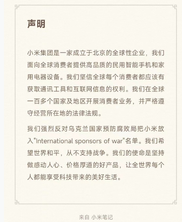 被乌克兰国家预防腐败局列入相关名单 小米回应:强烈反对