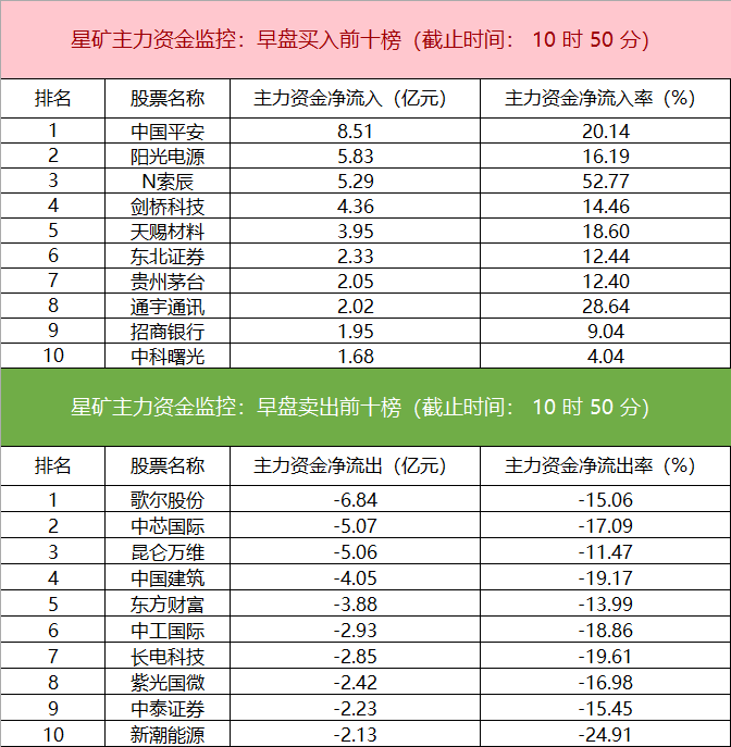 财联社4月18日电,财联社星矿数据显示,今日早盘主力资金净流入银行、保险、食品饮料等板块,净流出医药生物、证券、天然气等板块,其中净流出医药生物板块超11亿元。个股方面,中国平安上涨,主力资金净买入8.51亿元,阳光电源、N索辰、剑桥科技获主力资金净流入居前;歌尔股份遭净卖出超6亿元,中芯国际、昆仑万维、中国建筑主力资金净流出额居前。