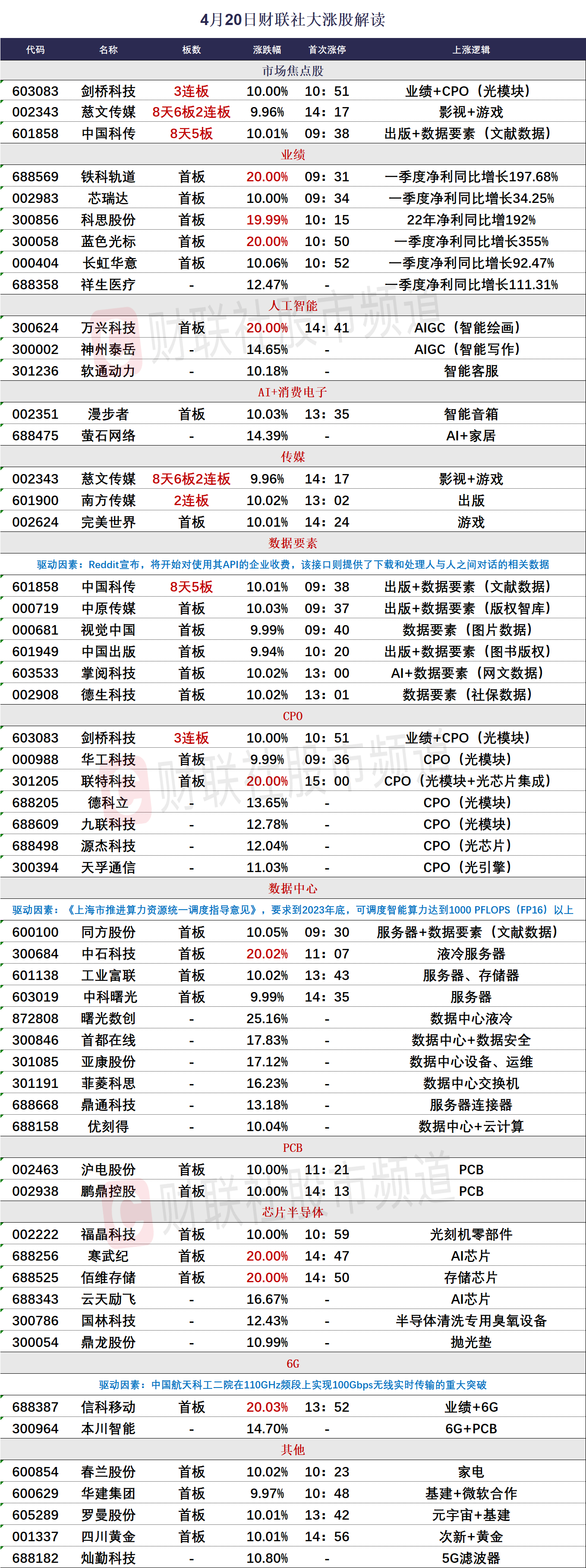 今日共33股涨停,连板股总数3只,10股封板未遂,封板率为77%(不含ST股、退市股及未开板新股)。个股方面,CPO概念股剑桥科技3板、联特科技创业板首板,传媒板块慈文传媒8天6板、南方传媒2板、蓝色光标创业板首板,数据要素概念股中国科传8天5板,业绩超预期的铁科轨道科创板首板、科思股份创业板首板,芯片产业链的寒武纪科创板首板、佰维存储科创板首板,数据中心板块中石科技创业板首板。今日收涨个股1569只,收跌个股3295只。