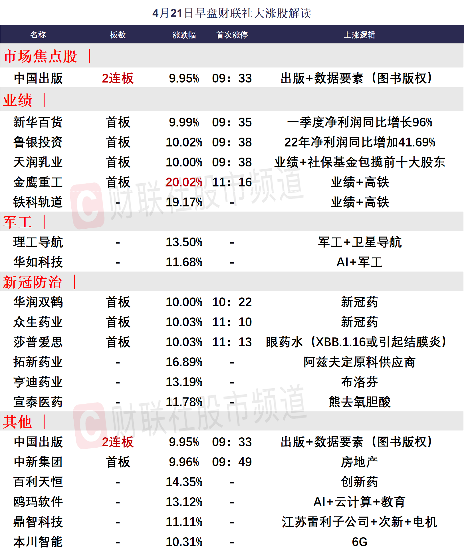 财联社4月21日电,今日午盘两市共9股涨停,连板股总数1只,13股封板未遂,封板率为41%(不含ST股、退市股及未开板新股)。个股方面,数据要素板块中国出版2板,业绩+高铁轨交的金鹰重工创业板首板。