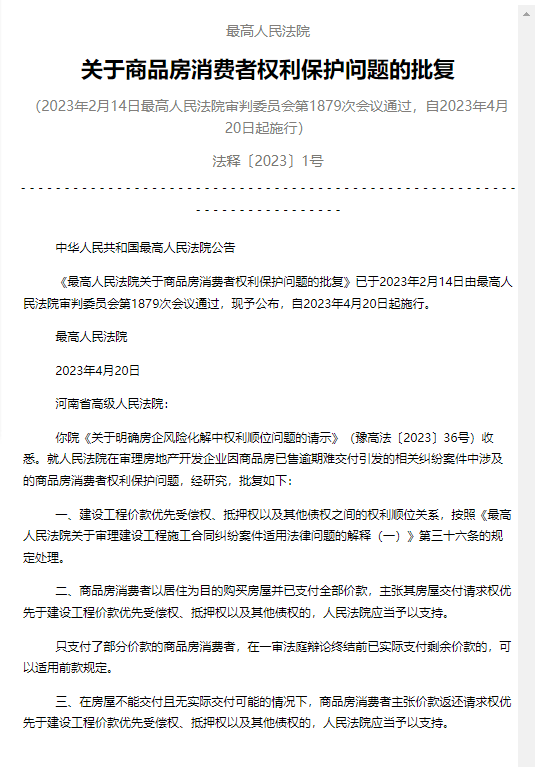 4月21日,人民法院报刊发了有关最高人民法院关于商品房消费者权利保护问题的批复,批复中第二、第三条均从保护商品房消费者权利角度,分别新增了商品房消费者主张其房屋交付请求权、商品房消费者主张价款返还请求权,即在相应条件下,这两项权利均优先于其他债权,该批复自2023年4月20日起施行。多位律师告诉记者,“相关权利均为新增,以前没有这样明确规定,抵押权等一直优先于其他债权。”(财联社记者 陈业)
