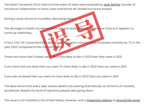 slaynews发布的文章提到,提供“完成新冠mRNA疫苗完全接种的人将损失预期寿命”这一说法的是个名叫斯特灵(Josh Stirling)的保险分析师。他在分析美国CDC公布的全因死亡率数据后得出结论:与2021年的数据相比,那些接种过5剂新冠疫苗的人在2022年死亡的可能性要比2021年高出35%;一个接种过4到5针疫苗且当下年龄为30岁的人最多可以活到55岁,而没有打过疫苗的人的平均年龄在80岁左右。