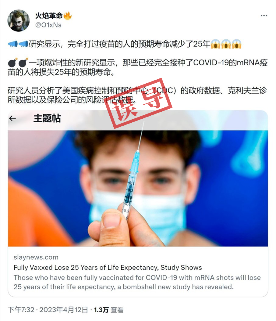 有关推文附有一条来自slaynews网站的链接。该链接指向一篇题为《研究显示,全程接种疫苗会损失25年的预期寿命》的英文文章。