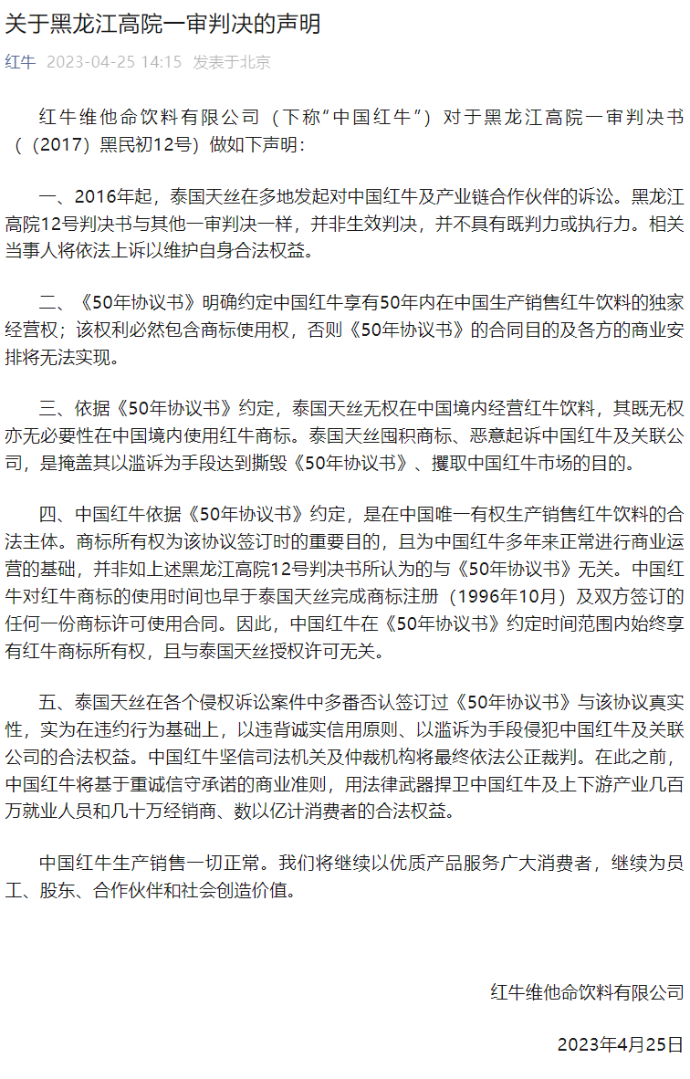 财联社4月25日电,红牛维他命饮料有限公司(下称“中国红牛”)发布声明称,2016年起,泰国天丝在多地发起对中国红牛及产业链合作伙伴的诉讼。黑龙江高院12号判决书与其他一审判决一样,并非生效判决,并不具有既判力或执行力。《50年协议书》明确约定中国红牛享有50年内在中国生产销售红牛饮料的独家经营权。依据《50年协议书》约定,泰国天丝无权在中国境内经营红牛饮料,其既无权亦无必要性在中国境内使用红牛商标。中国红牛在《50年协议书》约定时间范围内始终享有红牛商标所有权,且与泰国天丝授权许可无关。中国红牛生产销售一切正常。