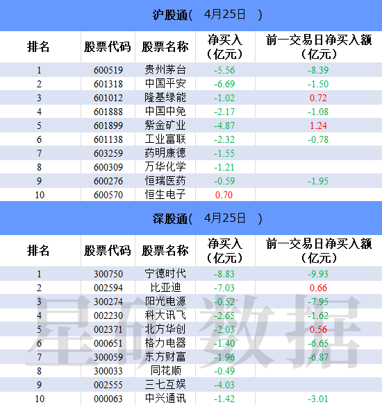 财联社4月25日电,北向资金今日净卖出49.17亿元。宁德时代、比亚迪、中国平安分别获净卖出8.83亿元、7.03亿元、6.69亿元。恒生电子净买入额居首,金额为0.7亿元。