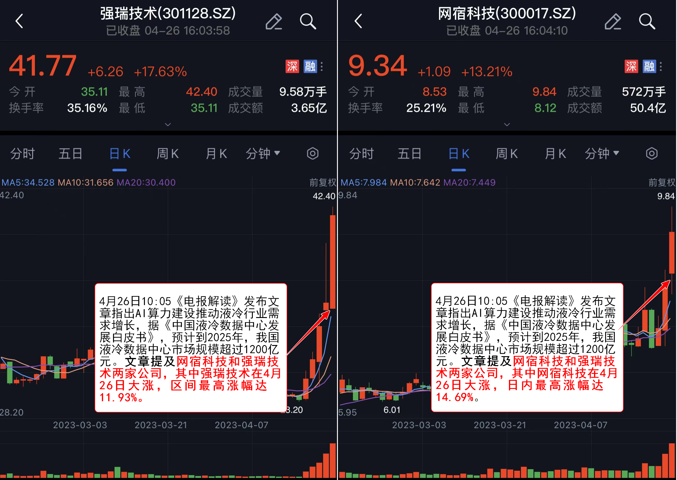 4月26日10:05《电报解读》发布文章指出 AI算力建设推动液冷行业需求增长 ,据《中国液冷数据中心发展白皮书》,预计到2025年,我国液冷数据中心市场规模超过1200亿元。文章提及网宿科技和强瑞技术两家公司,其中网宿科技在4月26日大涨,日内最高涨幅达14.69%;强瑞技术在4月26日大涨,区间最高涨幅达11.93%。