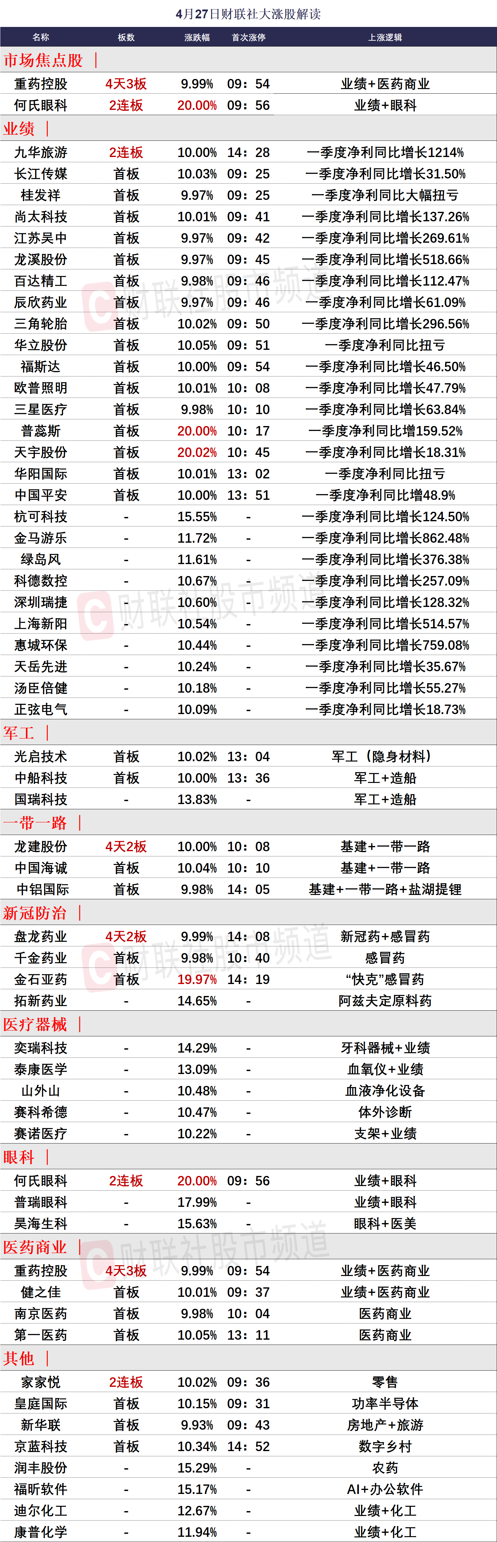 今日共34股涨停,连板股总数3只,15股封板未遂,封板率为69%(不含ST股、退市股及未开板新股)。个股方面,业绩超预期的重药控股4天3板、何氏眼科创业板2板、九华旅游2板,零售股家家悦2板,新冠防治概念股盘龙药业4天2板、金石亚药创业板首板,一带一路+基建的龙建股份4天2板。今日收涨个股2552只,收跌个股2224只。