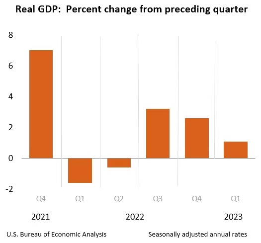北京时间周四晚上,美国公布了第一季度GDP、核心价格指数等多个经济数据,持续加息带来的负面效应也得以显现,经济增速大幅放缓的同时,通胀再次升温。具体来看: