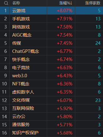 财联社4月28日电,大盘全天低开高走,沪指涨超1%重回3300点。两市近百股涨停,近150只个股涨停或涨超10%。盘面上,AI概念股全线反弹大涨,游戏、传媒等应用方向领涨,万兴科技、昆仑万维、掌趣科技、冰川网络等超10股20CM涨停。大金融股盘中走强,财富趋势20CM涨停,华西证券、中国银河均一度涨停,新华保险涨超8%。一带一路、中字头概念股午后拉升,秦港股份、小商品城、华建集团等涨停。半导体板块展开反弹,佰维存储涨超10%,大港股份、兴森科技涨停。下跌方面,猪肉股陷入调整,广弘控股、东瑞股份跌超9%。总体上个股涨多跌少,两市超3800只个股上涨。沪深两市今日成交额11169亿,较上个交易日放量720亿。板块方面,游戏、传媒、ChatGPT、CPO等板块涨幅居前,猪肉、一体化压铸、医药商业、新冠药等板块跌幅居前。截至收盘,沪指涨1.14%,深成指涨1.08%,创业板指涨0.76%。北向资金全天净买入15.85亿元,其中沪股通净卖出7.89亿元,深股通净买入23.74亿元。