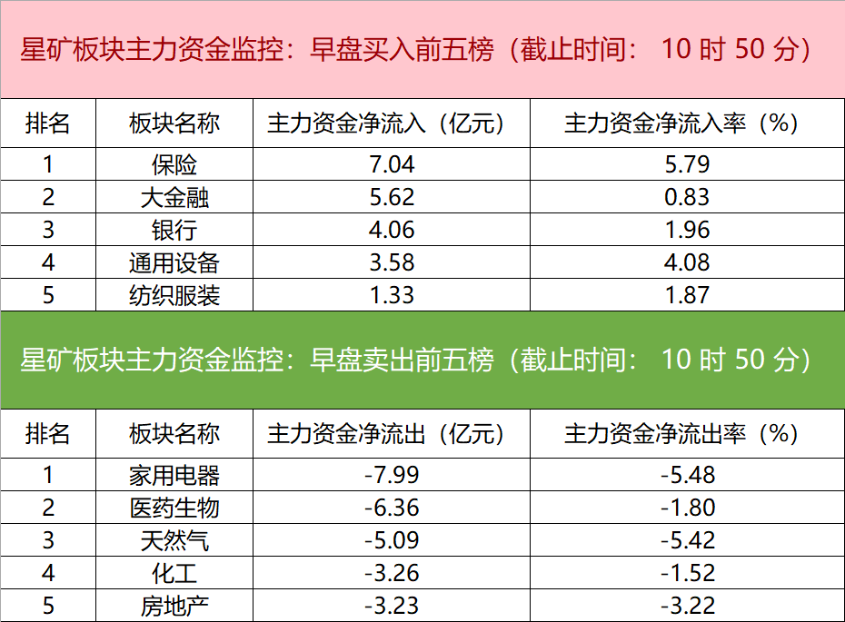 财联社5月4日电,财联社星矿数据显示,今日早盘主力资金净流入保险、大金融、银行等板块,净流出家用电器、医药生物、天然气等板块,其中净流出家用电器板块超7亿元。个股方面,分众传媒涨停,主力资金净买入6.86亿元,中国平安、机器人、鸿博股份获主力资金净流入居前;格力电器遭净卖出超11亿元,三六零、掌趣科技、中国中免主力资金净流出额居前。