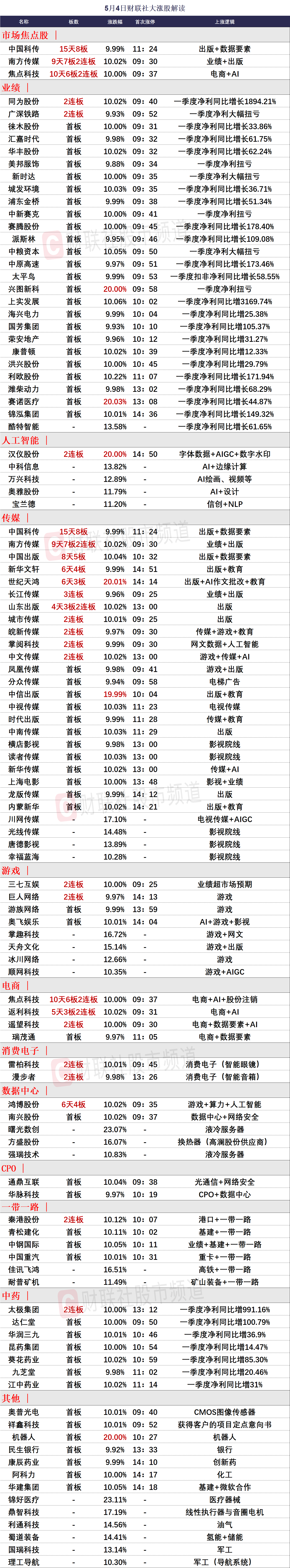 今日共82股涨停,连板股总数19只,15股封板未遂,封板率为84%(不含ST股、退市股及未开板新股)。个股方面,传媒板块中国科传15天8板、南方传媒9天7板、中国出版8天5板、世纪天鸿创业板6天3板、长江传媒3连板,电商股焦点科技10天6板、返利科技5天3板,人工智能概念股汉仪股份创业板2板,游戏+算力的鸿博股份6天4板,一带一路板块秦港股份2板,中药股太极集团2板。今日收涨个股2895只,收跌个股1914只。