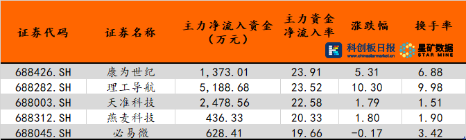 《科创板日报》4日讯,科创板日报•星矿数据统计显示,今日主力资金净流入的科创板个股共有194只,康为世纪净流入1373.01万元,主力资金净流入率居首;理工导航、天准科技紧随其后。主力资金净流出的科创板个股共322只,瑞联新材流出率最高,共流出2067.94万元,其次是百克生物、铂力特。