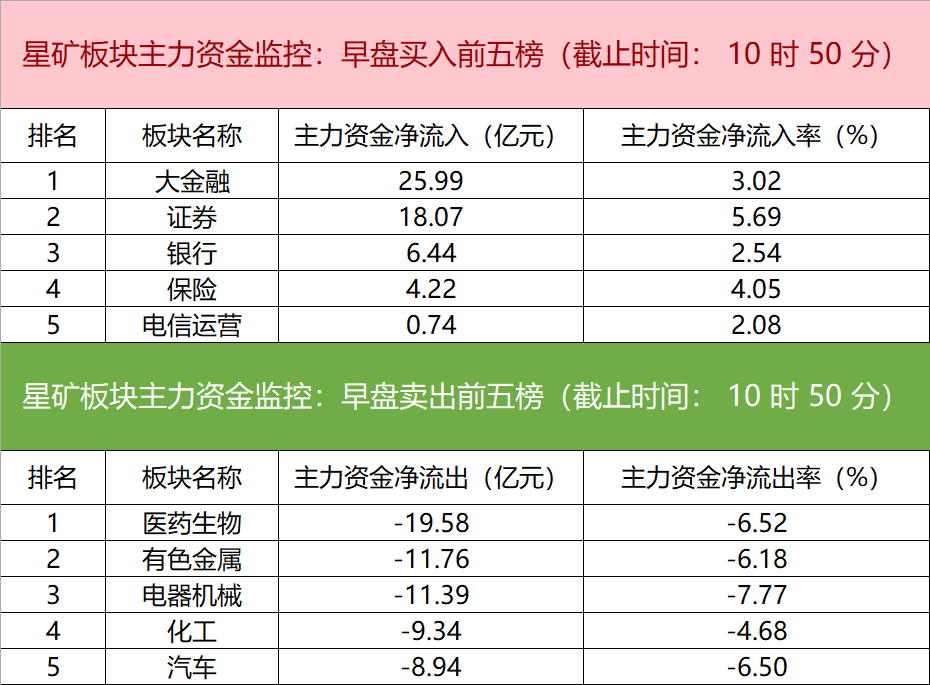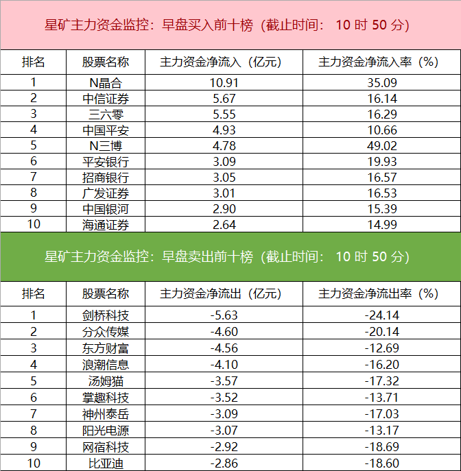 财联社5月5日电,财联社星矿数据显示,今日早盘主力资金净流入大金融、证券、银行等板块,净流出医药生物、有色金属、电器机械等板块,其中净流出医药生物板块超19亿元。个股方面,N晶合上涨,主力资金净买入10.91亿元,中信证券、三六零、中国平安获主力资金净流入居前;剑桥科技遭净卖出超5亿元,分众传媒、东方财富、浪潮信息主力资金净流出额居前。