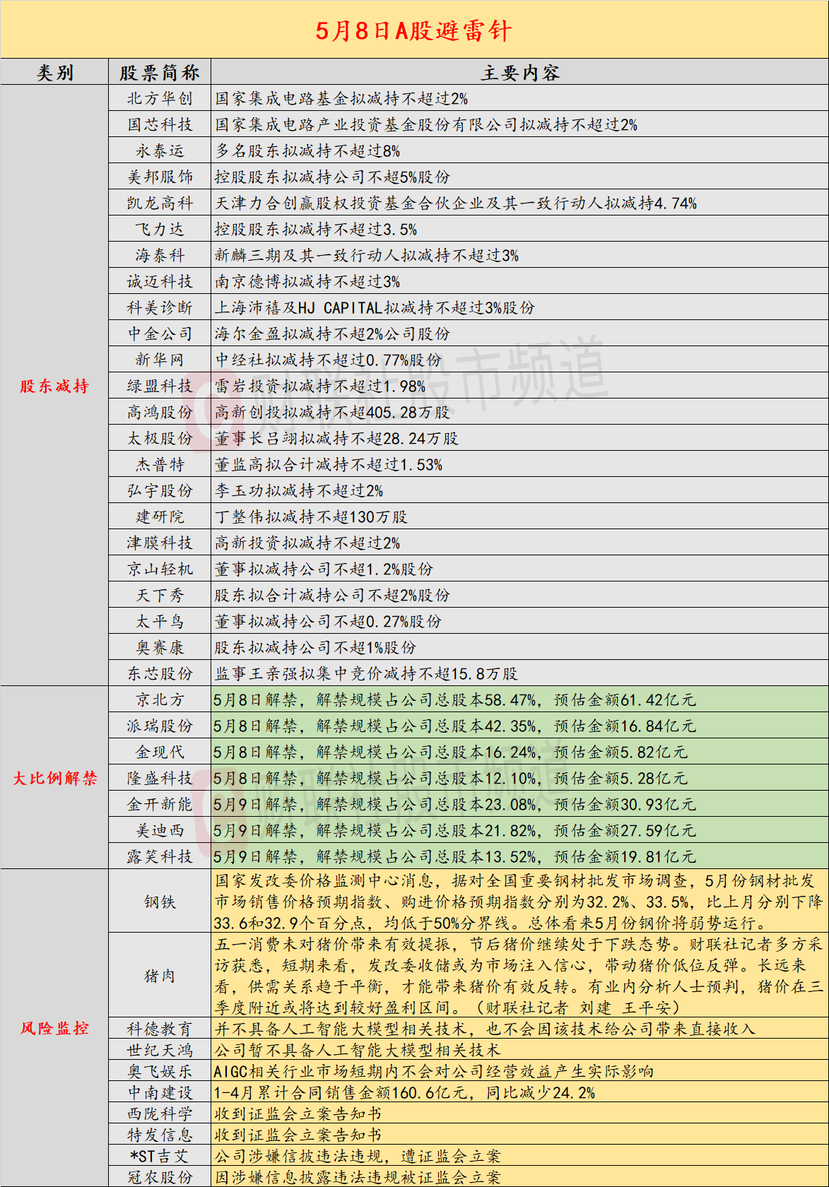 近日A股拟减持规模较之前有所增多,北方华创股东国家集成电路基金拟减持不超过2%,国芯科技股东国家集成电路基金拟减持不超过2%;京北方、派瑞股份将迎来超四成以上解禁;国家发改委价格监测中心消息,调查显示5月份钢材市场预期偏弱;科德教育公告,并不具备人工智能大模型相关技术,也不会因该技术给公司带来直接收入;五一节后生猪现货继续下跌,收储或提振市场信心;奥飞娱乐称AIGC相关行业市场短期内不会对公司经营效益产生实际影响;非农就业数据超预期,现货黄金一度跌破2000美元/盎司关口。