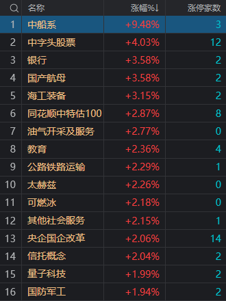 财联社5月8日电,市场早盘走势分化,沪指高开高走涨超1.5%创年内新高,盘中一度站上3400点,创业板指震荡微涨。盘面上,大金融股全线爆发,中信银行、西安银行、中国银河涨停,中国银行接近涨停,农业银行股价创历史新高。中字头、一带一路概念股继续活跃,中船汉光20CM涨停,中国船舶、中油资本等超10股涨停。风电、储能等赛道股盘中一度反弹,金冠电气20CM涨停,大金重工、泰永长征涨停。下跌方面,医药股陷入调整,众生药业、百利天恒等跌超5%。总体上个股涨多跌少,两市超2500只个股上涨。沪深两市今日成交额7384亿,较上个交易日放量161亿。板块方面,中船系、银行、中字头、油气等板块涨幅居前,旅游、CRO、医疗器械、创新药等板块跌幅居前。截至上午收盘,沪指涨1.56%,深成指涨0.31%,创业板指涨0.01%。北向资金方面,其中沪股通早盘净流入28.37亿,深股通早盘净流出0.4亿。