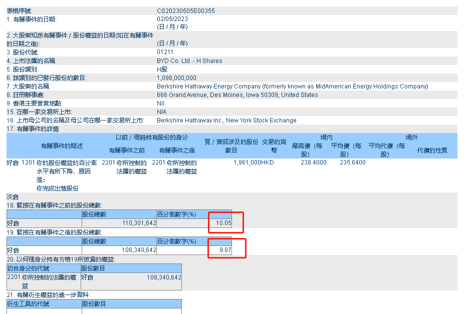 伯克希尔对比亚迪H股的持股比例调至10%以下
