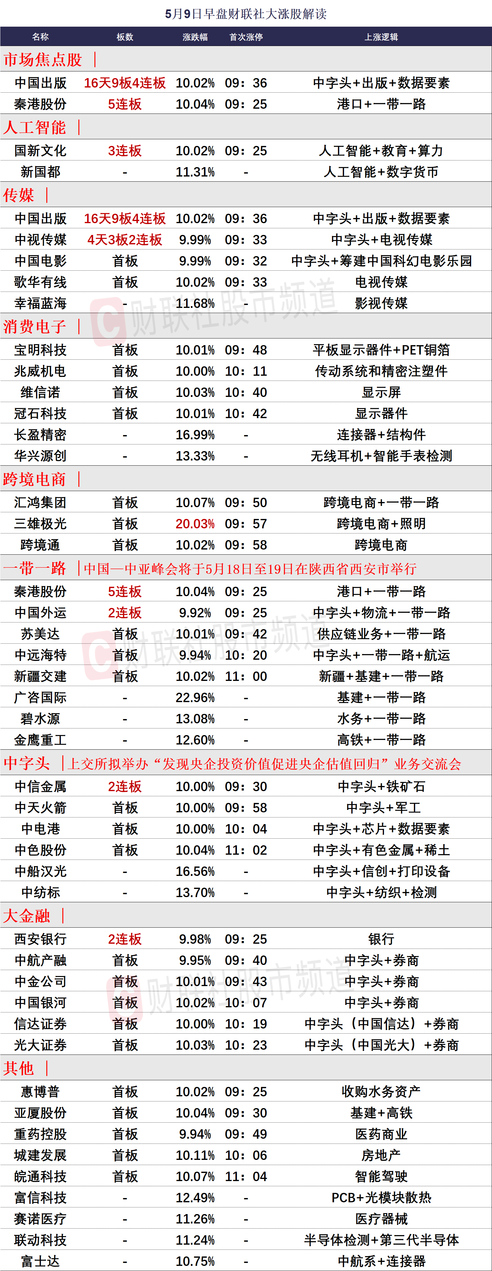 今日午盘两市共32股涨停,连板股总数7只,9股封板未遂,封板率为78%(不含ST股、退市股及未开板新股)。个股方面,传媒股中国出版16天9板、中视传媒4天3板,一带一路板块秦港股份5板、中国外运2板,AI+教育的国新文化3板,大金融板块西安银行2板。