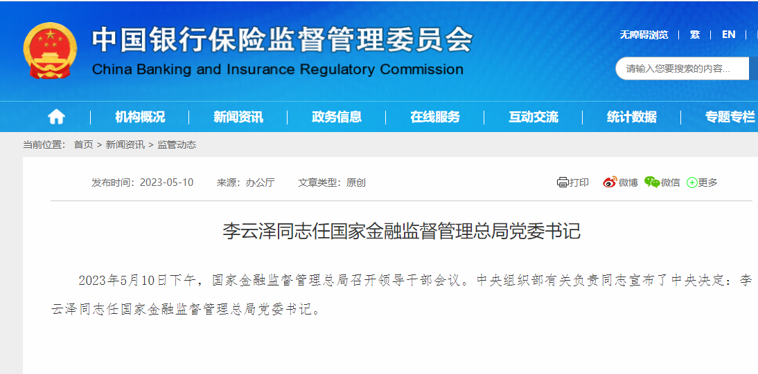 李云泽同志任国家金融监督管理总局党委书记