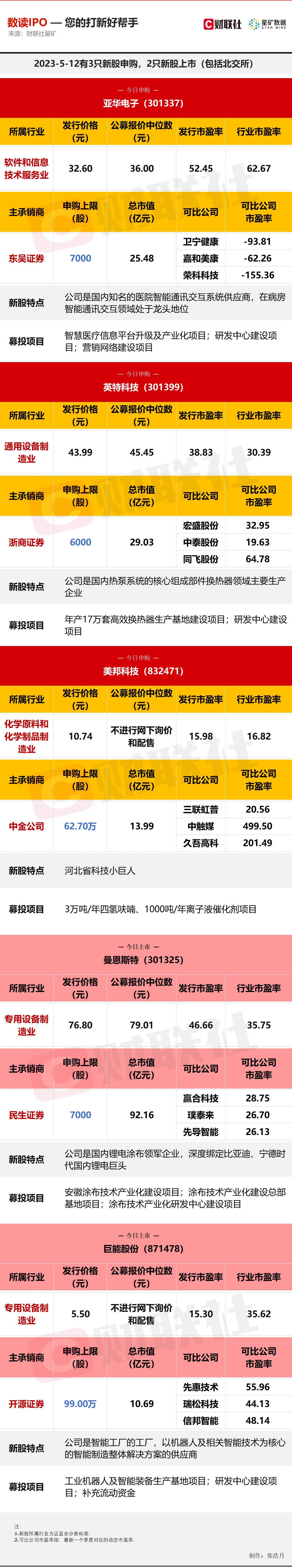 财联社5月12日电,今日3只新股申购,分别为创业板的亚华电子、英特科技,北交所的美邦科技;2只新股上市,分别为创业板的曼恩斯特,北交所的巨能股份。