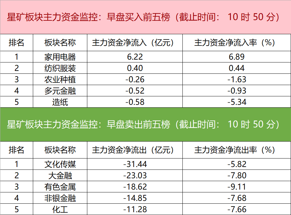财联社5月12日电,财联社星矿数据显示,今日早盘主力资金仅净流入家用电器和纺织服装板块,净流出文化传媒、大金融、有色金属等板块,其中净流出文化传媒板块超31亿元。个股方面,N曼恩大涨,主力资金净买入6.12亿元,四川长虹、中芯国际、科大讯飞获主力资金净流入居前;汤姆猫遭净卖出超3亿元,东方财富、天娱数科、隆基绿能主力资金净流出额居前。