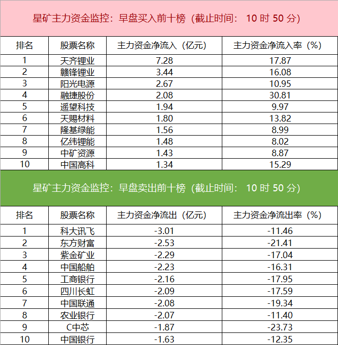 财联社5月15日电,财联社星矿数据显示,今日早盘主力资金净流入有色金属、化工、通用设备等板块,净流出大金融、文化传媒、非银金融等板块,其中净流出大金融板块超37亿元。个股方面,天齐锂业大涨,主力资金净买入7.28亿元,赣锋锂业、阳光电源、融捷股份获主力资金净流入居前;科大讯飞遭净卖出超3亿元,东方财富、紫金矿业、中国船舶主力资金净流出额居前。