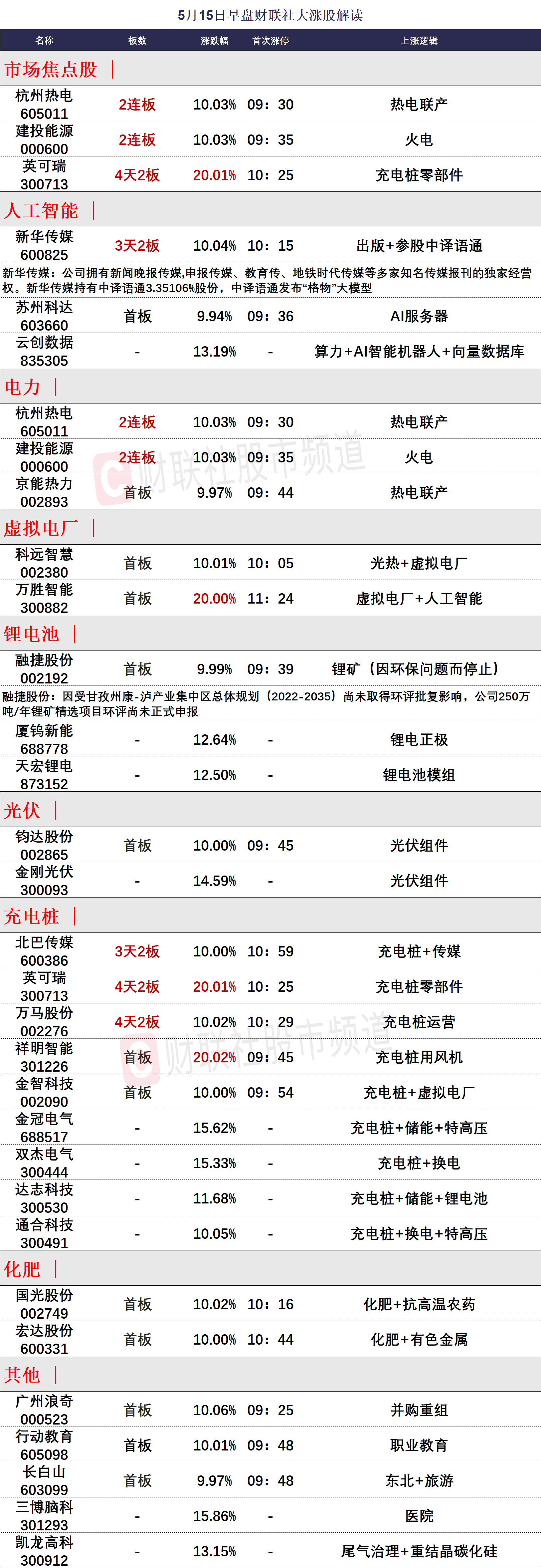 今日午盘两市共19股涨停,连板股总数2只,12股封板未遂,封板率为61%(不含ST股、退市股及未开板新股)。个股方面,电力股杭州热电2板、建投能源2板,充电桩板块北巴传媒3天2板、英可瑞创业板4天2板,传媒+AI的新华传媒3天2板。