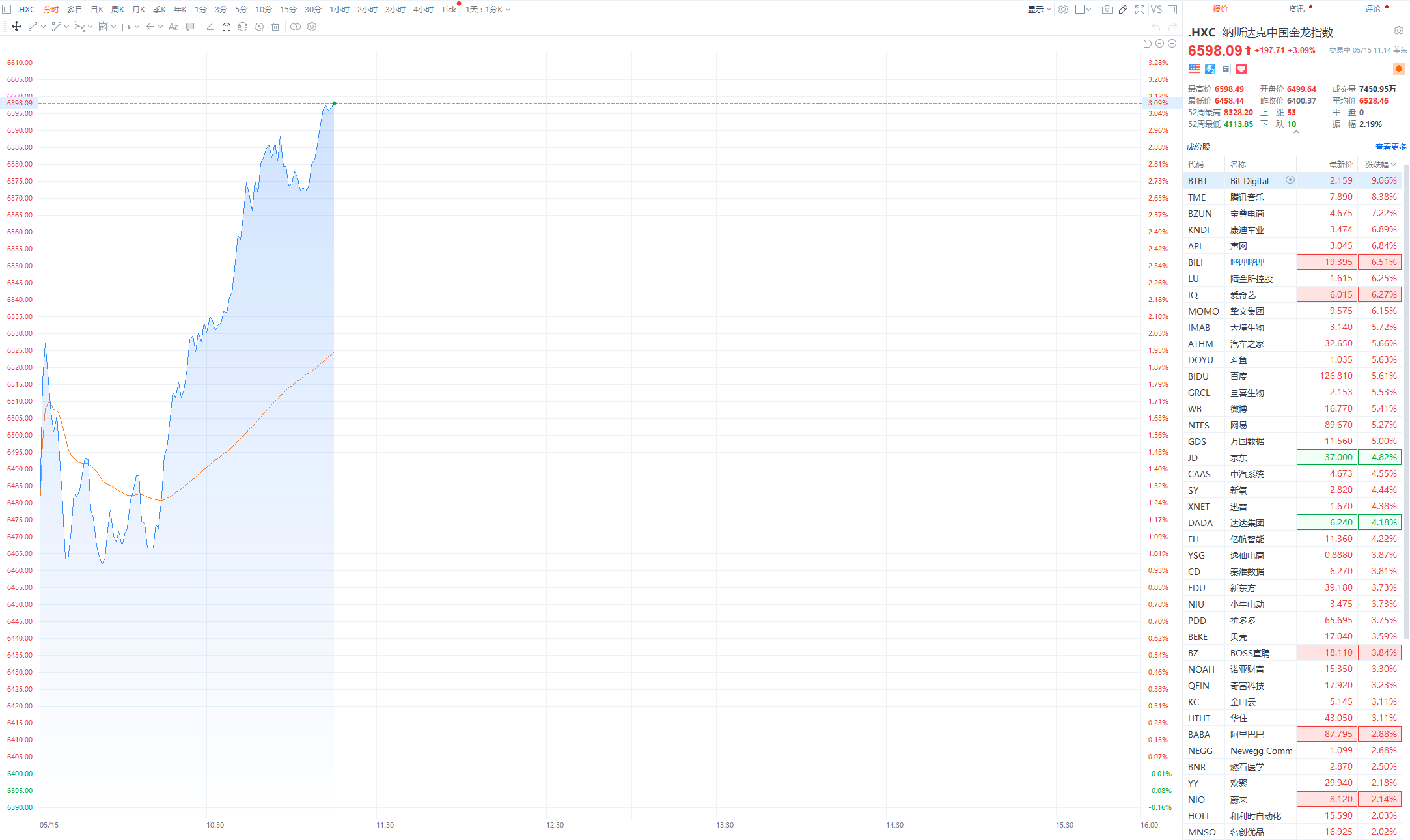 财联社5月15日电,纳斯达克中国金龙指数涨超3%,成分股腾讯音乐和比特数字涨超9%领跑,B站和百度涨超5%。