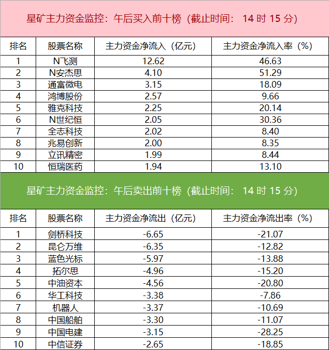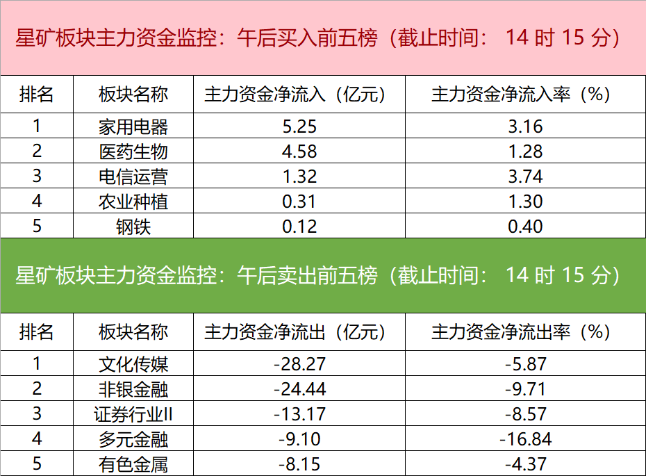 财联社5月19日电,财联社星矿数据显示,今日主力资金净流入家用电器、医药生物、电信运营等板块,净流出文化传媒、非银金融、证券行业Ⅱ等板块,其中文化传媒板块净流出28.27亿。个股方面,N飞测大涨,主力资金净买入12.62亿元,N安杰思、通富微电、鸿博股份等获主力资金净流入居前;剑桥科技遭净卖出超6亿,昆仑万维、蓝色光标、拓尔思等主力资金净流出额居前。